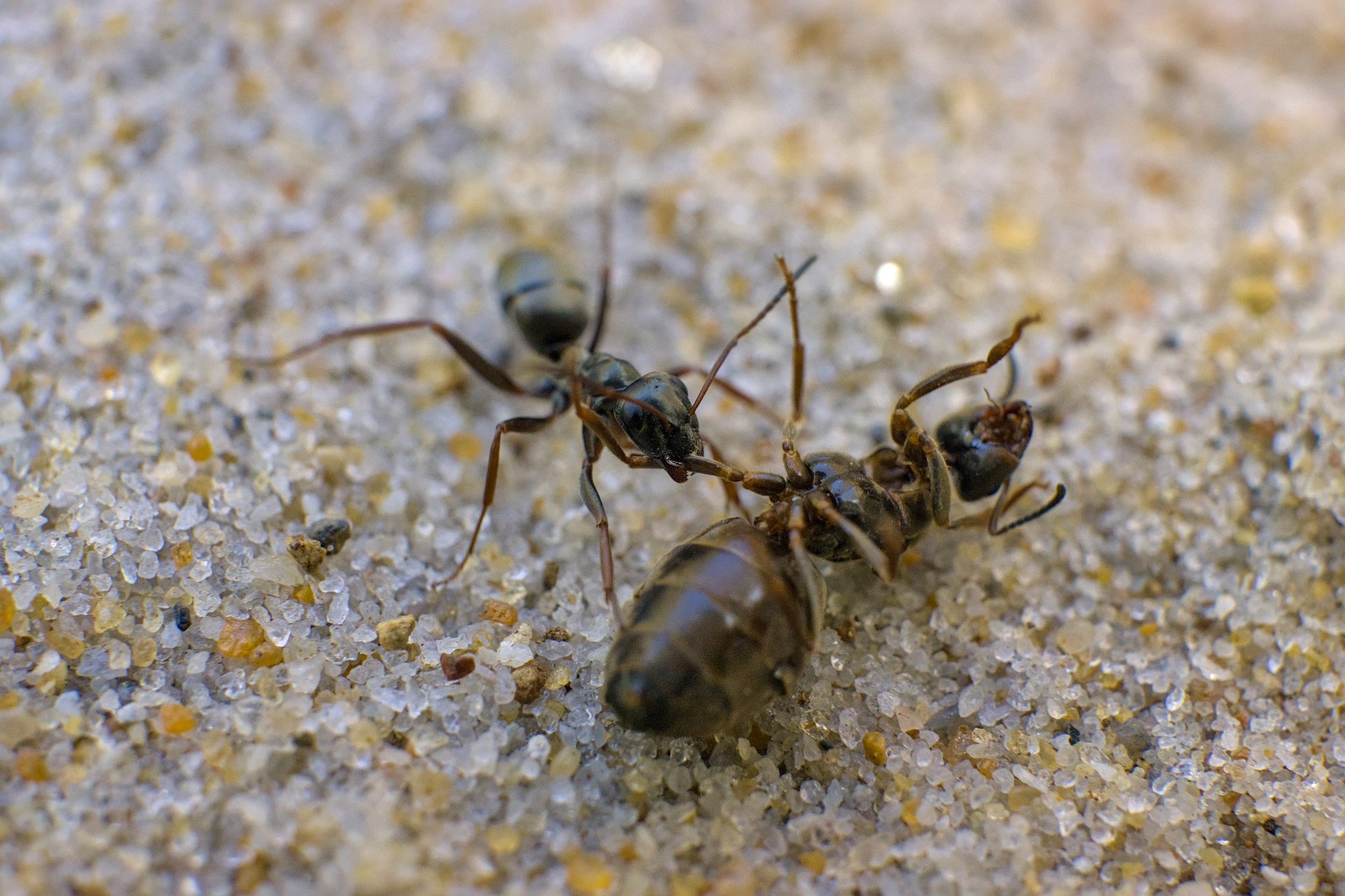 Муравей поменьше куда-то тащит муравья побольше. Муравей побольше как бы говорит ему: «Ах, оставьте!»