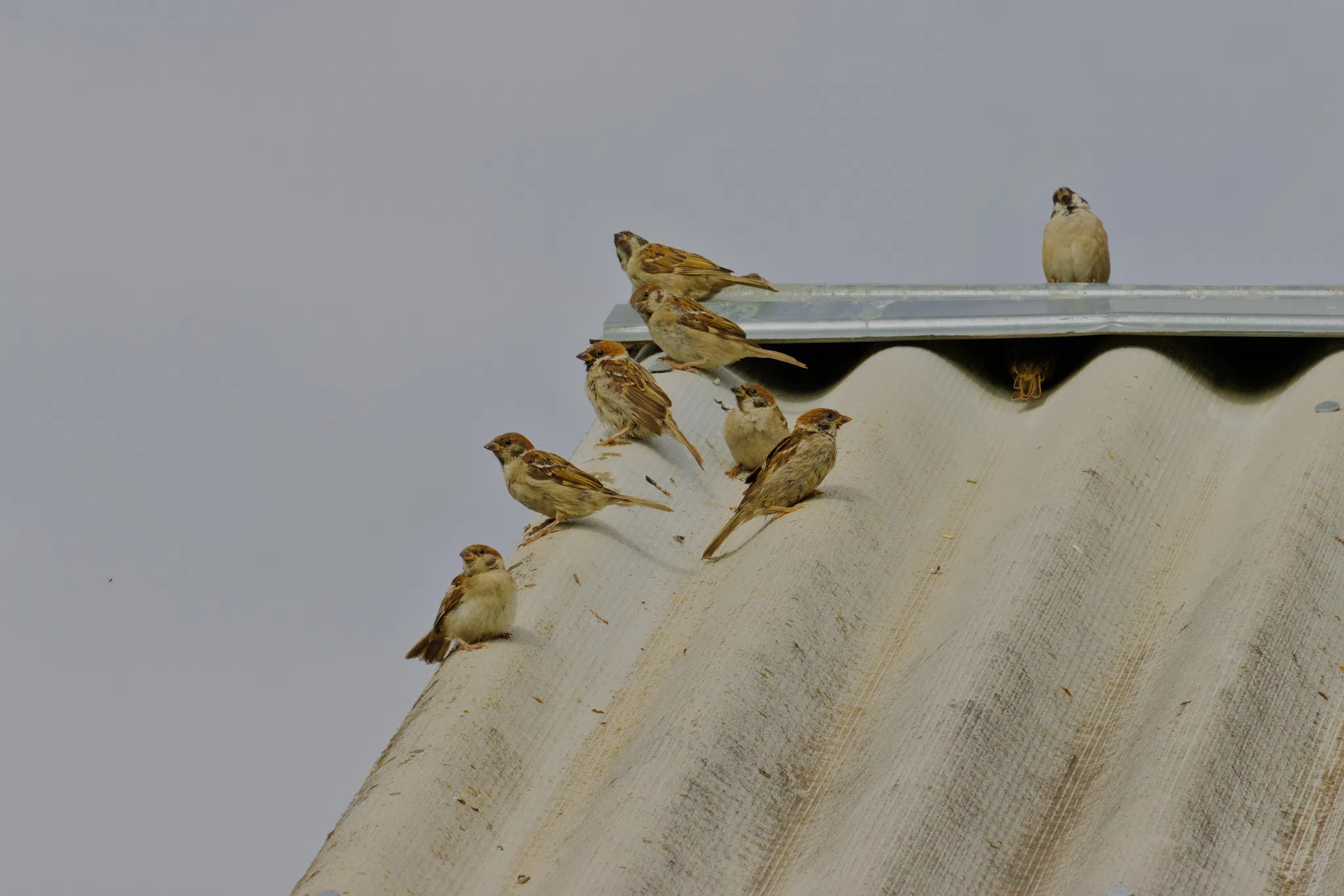 Стайка воробушков на крыше.